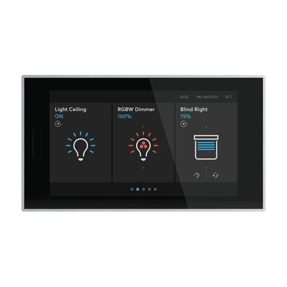 | Длинное описание: | Multifunctional HD IPS KNX touchdisplay as a room control element for visualisation and control of all functions in a KNX system. For the display and intuitive control of the following standard KNX functions: Switching, rocker switch, dimming (4-bit and 8-bit), slider, blind, RGBW control element, room temperature control element, Split Unit control element, step switch, scene switch, display element or audio control element. Additional functions: 20 fault and alarm messages, 10 logic functions, 10 timers each with 6 switching times, 4 scene actuators, 1 room temperature controller and individual pages can be protected with a PIN code. Status display, display of date and time, as well as inside and outside temperature. Installed temperature sensor, proximity sensor and brightness sensor. With a push-button/switch input and external temperature sensor input. Page display with a maximum of 30 touch surfaces on 6 or 10 pages (dependent on the mounting method). Viewing angle display: 160° - 160°. Mounting via a separate flush-mounted box. External power supply: 20-32 VDC (SELV). |